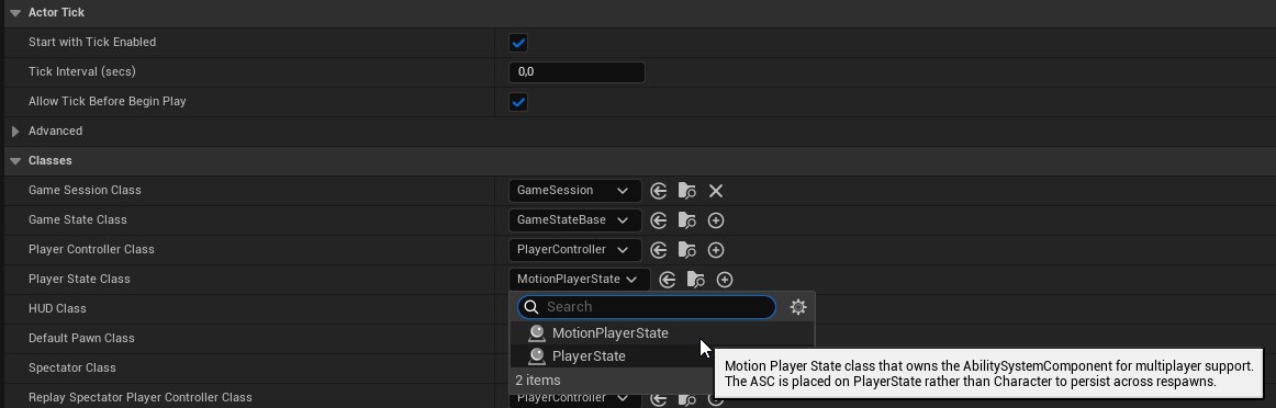AMotionPlayerState - Gameplay Ability System plugin enabled